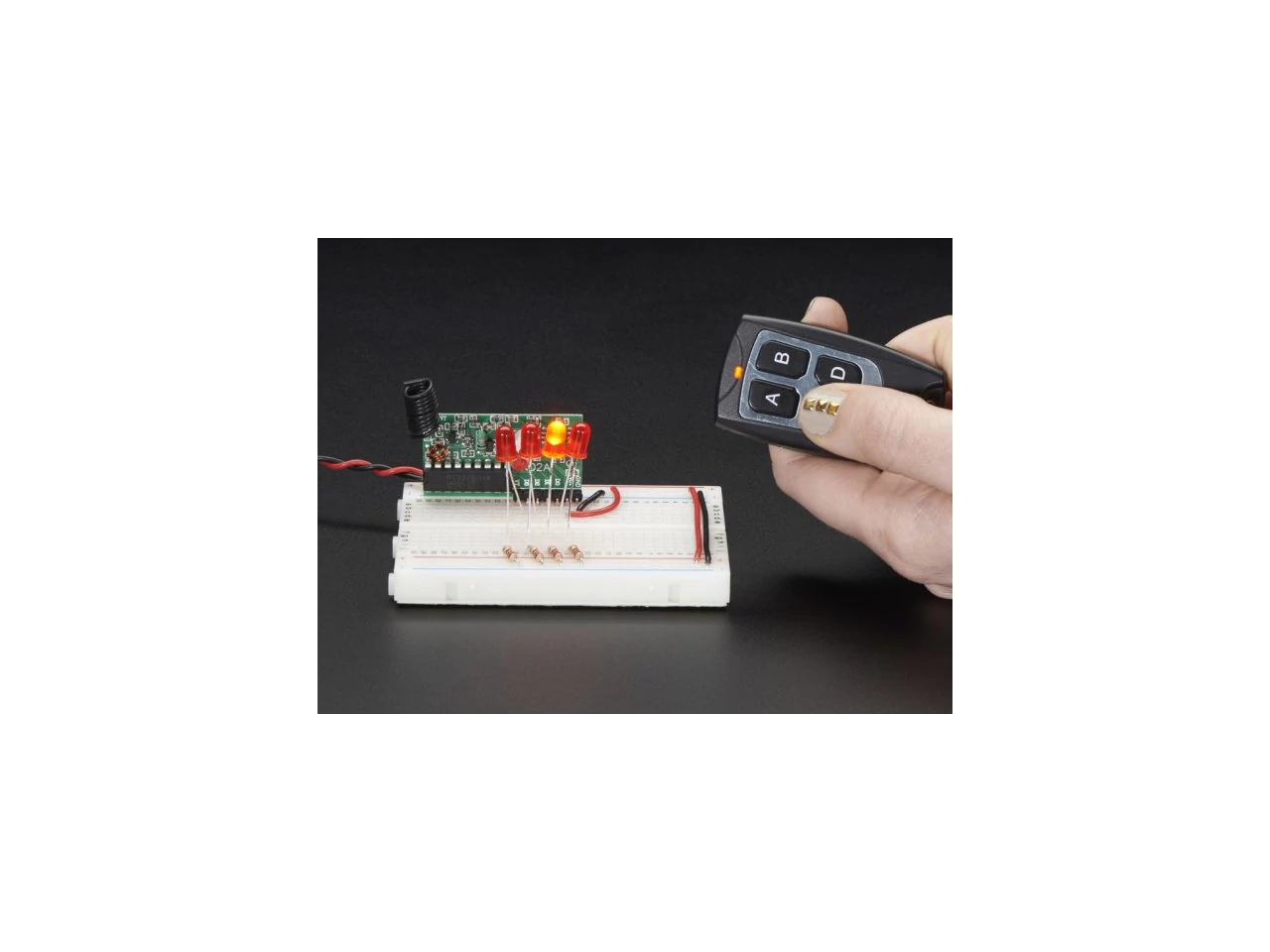 These Simple RF receivers are the easiest way possible to add wireless control, painlessly! There's no programming, configuring or addressing - simply power the receiver with ~5 VDC and press the buttons on our matching RF keyfob remote. When the A button is pressed, it activates the first pin, when the B button is pressed, it activates the second one, and so forth for all four buttons. There's no microcontroller required, its just a simple one-to-one link.