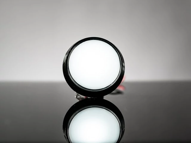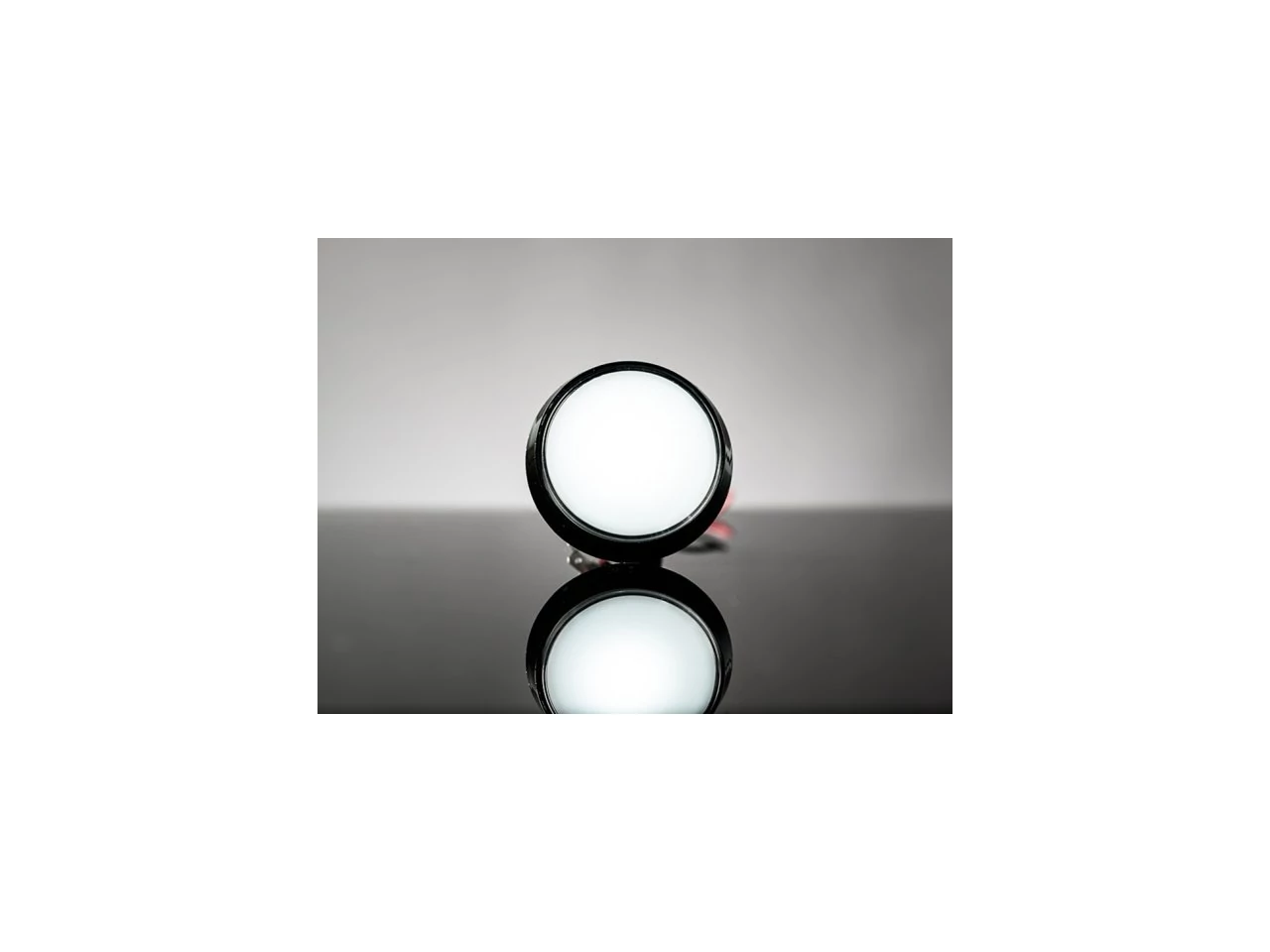 This button has a flat white plastic cover with a black retaining ring around it. There's an optional LED included that will light up the button. The LED has a built in resistor so you can run it up to 12V but given the shallow depth of the button, it doesn't illuminate the entire button face evenly. The button activates a common arcade microswitch (included), the switch contacts are normally open. When the button is pressed, the contacts close.