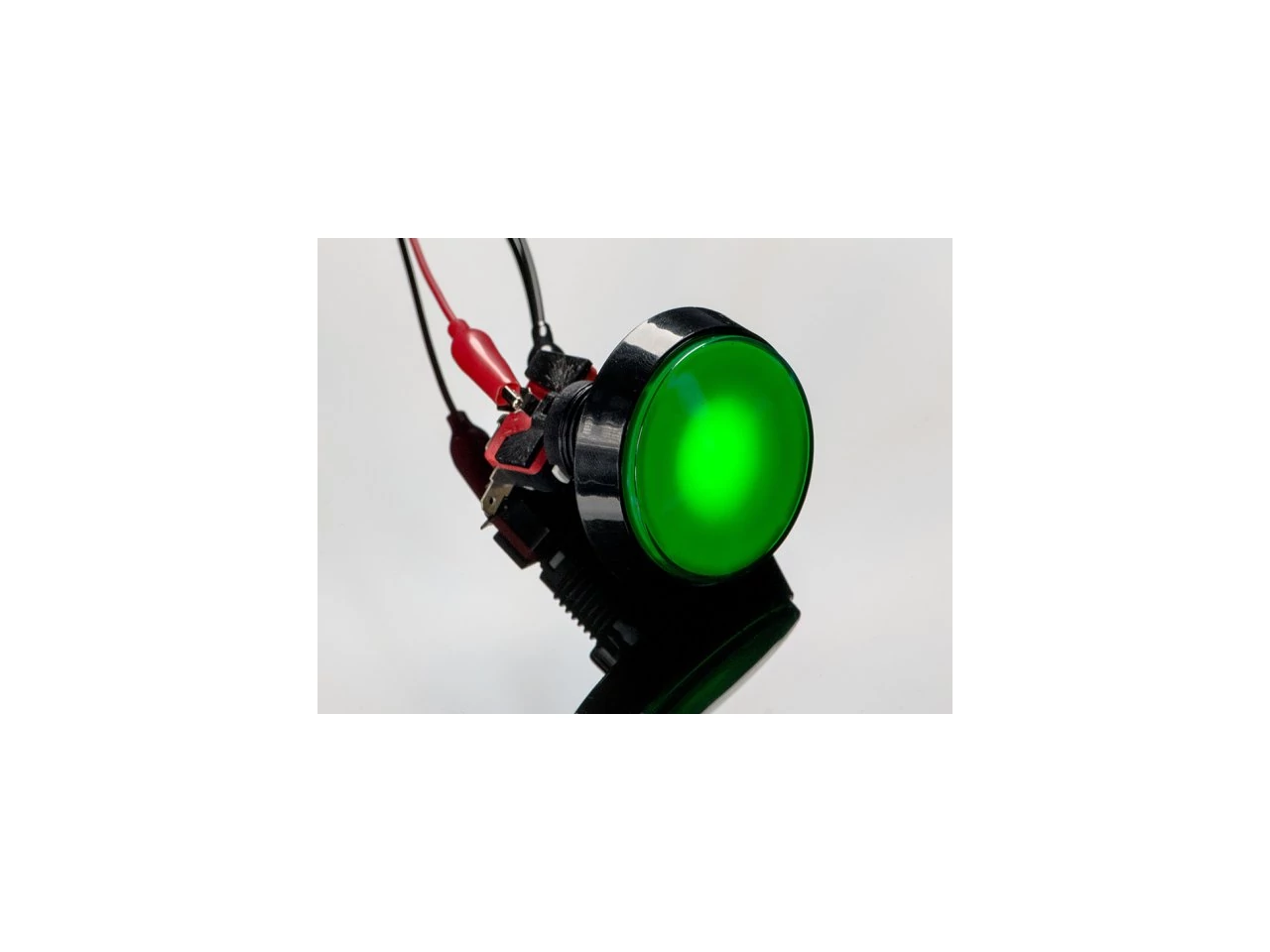 This button has a flat green plastic cover with a black retaining ring around it. There's an optional LED included that will light up the button. The LED has a built in resistor so you can run it up to 12V but given the shallow depth of the button, it doesn't illuminate the entire button face evenly. The button activates a common arcade microswitch (included), the switch contacts are normally open. When the button is pressed, the contacts close.