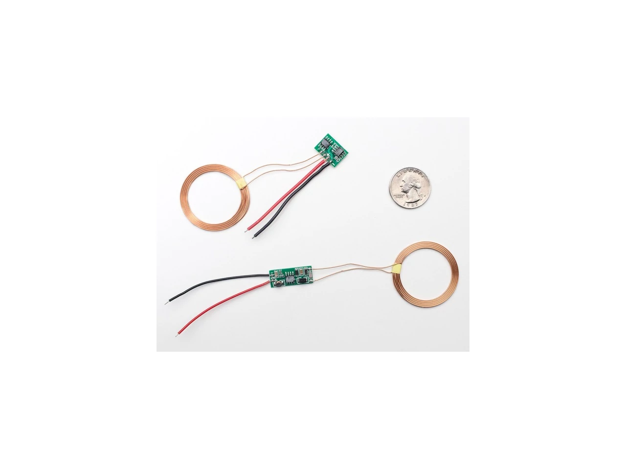 This is a basic charger set, and it does work, providing 5V DC output from the output half when the input half is powered with 9V to 12VDC. You can draw as much as ~500mA if the coils are 2 or 3 mm apart. If you only need 100 or 200mA you can be up 7mm apart. For 10mA draw, the coils can be up to half an inch (12.5mm) apart. Any non-ferrous/non-conductive material (eg air, wood, leather, plastic, paper, glass) can be used between the two coils. The material doesn't affect the distance or efficiency. The coils do need to be fairly co-axial, try to get them to be parallel and have the circles line up for best power-transfer. (This is why the electric toothbrush must fit into the plastic holder, it's lining up the two coils for best efficiency)