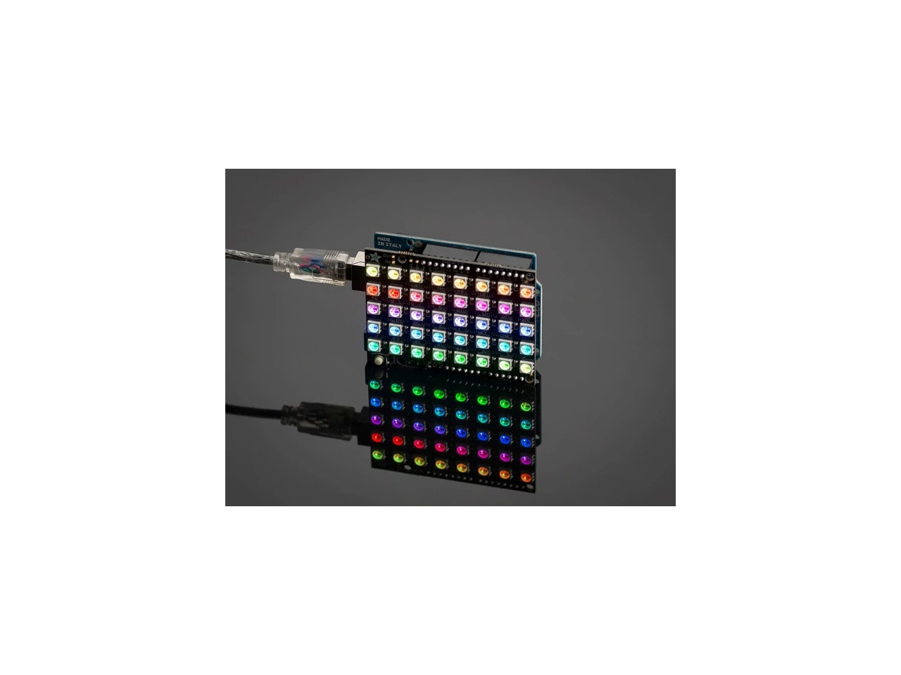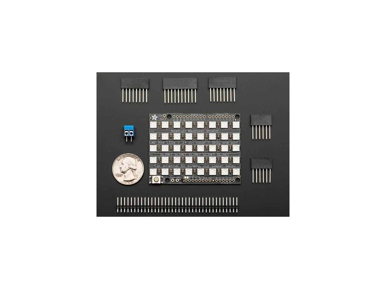 Put on your sunglasses before putting this shield onto your 'duino - 40 eye-blistering RGB LEDs adorn the NeoPixel shield for a blast of configurable color. Arranged in a 5x8 matrix, each pixel is individually addressable. Only one pin (Digital #6) is required to control all the LEDs. You can cut a trace and use nearly any other pin if you need some customization.