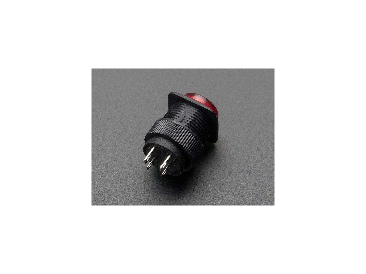 A nyomógomb háza fekete műanyag, egy belsejébe épített LED-del. Két érintkező van a kapcsoló részhez és kettő a LED-hez, egy + és egy - jelöléssel. A LED működtető feszültsége körülbelül 2,2 V, így csatlakoztass egy 220-1000 ohmos ellenállást sorba vele, ahogyan bármely más LED-hez csatlakoztatnád, ha 3 V-os vagy annál magasabb tápfeszültségről üzemeltetnéd.