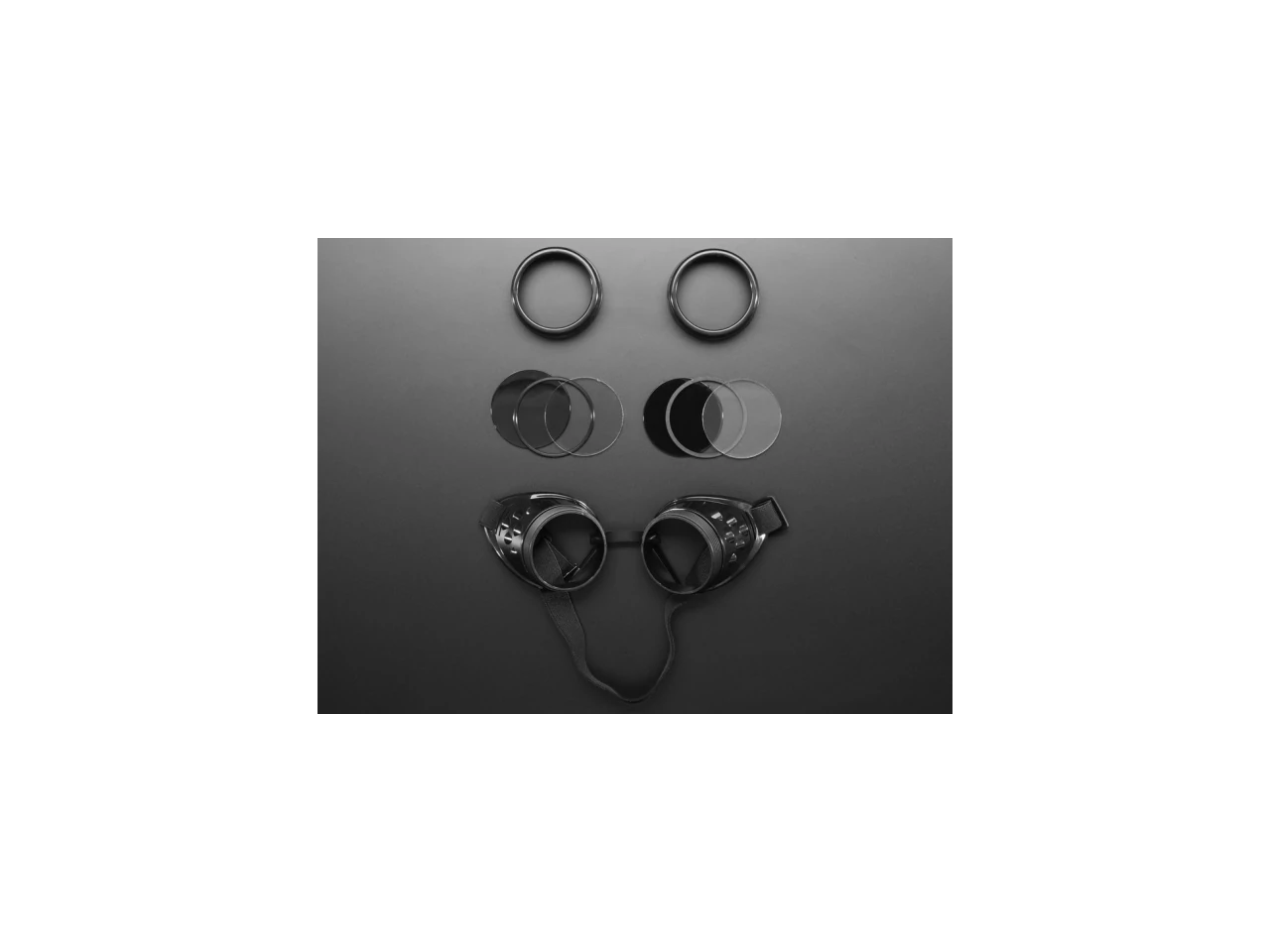 The goggles are fully plastic and have screw-off lens-holders. Each goggle comes with two lenses per eye: one clear glass and one 50% tint plastic. The dark tint lens makes it so you can stuff electronics into the goggles without people being able to see them, but still lets thru plenty of light from your LEDs. Of course, they fit our NeoPixel 16 rings quite well (that's what we got 'em for!)