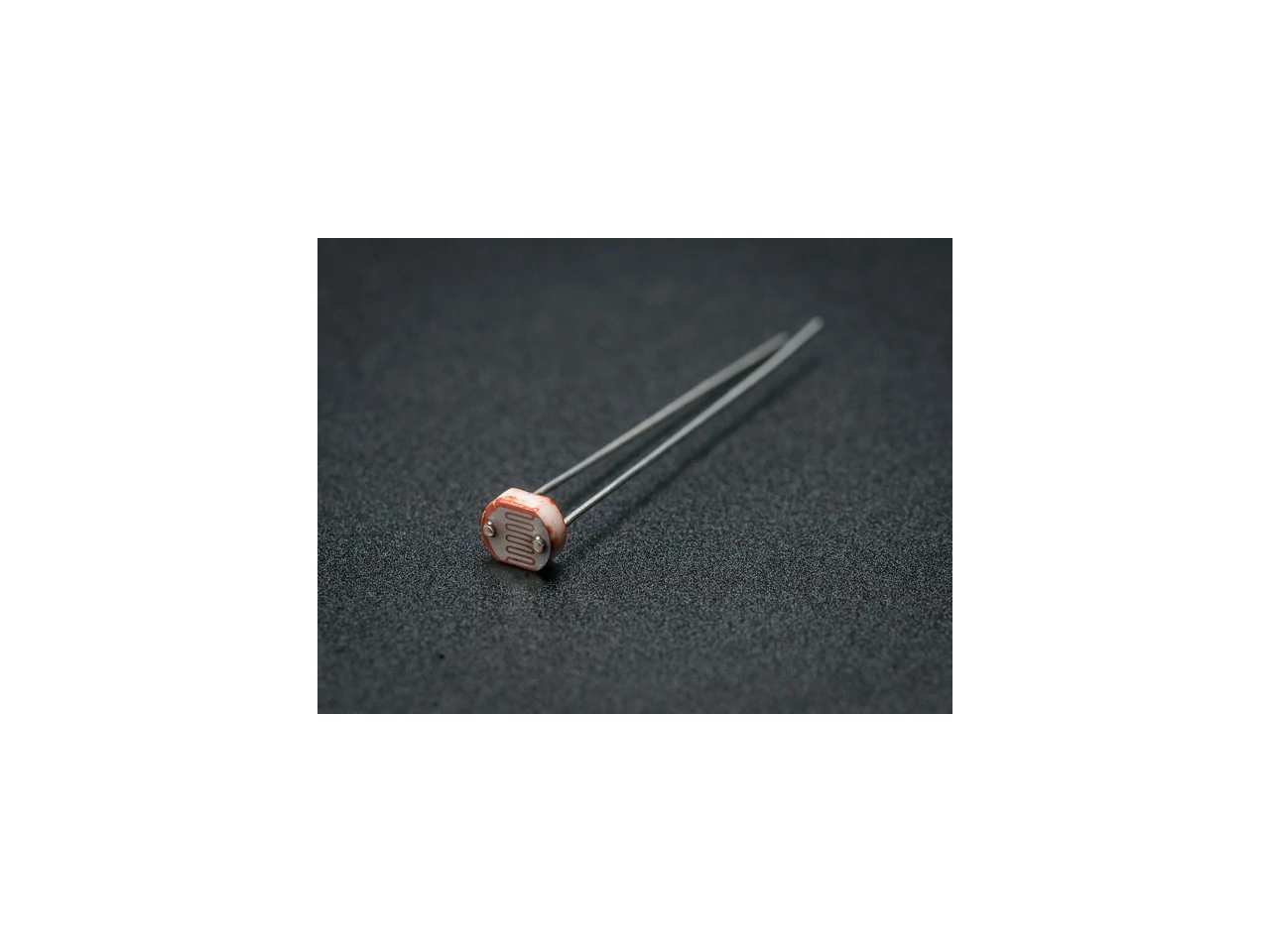 Adafruit 161 Photo cell - CdS fotoresistor. A CdS sejtek kis fényérzékelők. Amikor a cirkalmas felület több fényt kap, az átmeneti ellenállása lecsökken. Teljes fényben az ellenállás kb. 5-10K ohm, míg sötétben ez az érték felmegy 200K ohm-ig.