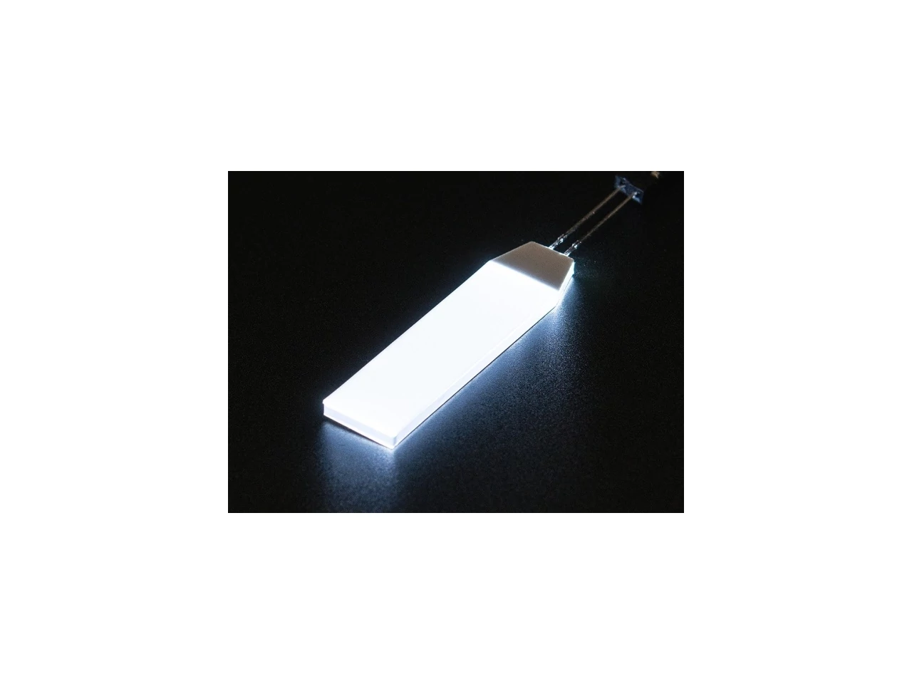 These pretty strips of light are plastic diffused backlights, often seen in LCD displays. Normally they're tucked behind the LCD and shine white light from below. Here, we've got the LEDs available individually and they're really cool! Each LED is encased in a 3.5mm thick strip of a acrylic. The acrylic strip is a special type that is very good at diffusing light, so even though there is only one single white LED, it provides near-uniform lighting. The other flat side of the strip has a reflector on it so you only get light from the top (otherwise the backlight would lose 1/2 the brightness unnecessarily)