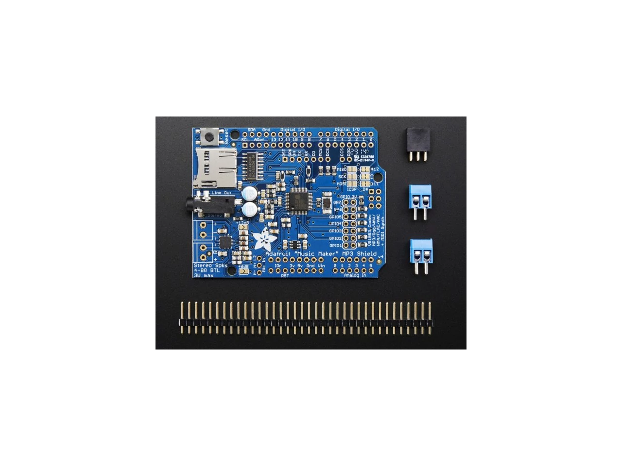 Állítsd be a hangzást tetszésed szerint az Adafruit Music Maker shield segítségével. A shielden egy VS1053 codec chip található, amely az audio fájlformátumok széles skálájának kezelésére alkalmas (MP3, AAC, Ogg Vorbis, WMA, MIDI, FLAC, WAV (PCM és ADPCM). A shield hangfelvétel készítésére is használható PCM (WAV) és tömörített Ogg Vorbis formátumban, emellett még számos további funkcióval rendelkezik, mint például a digitális hangszín (magas, mély) és hangerő szabályozás.
