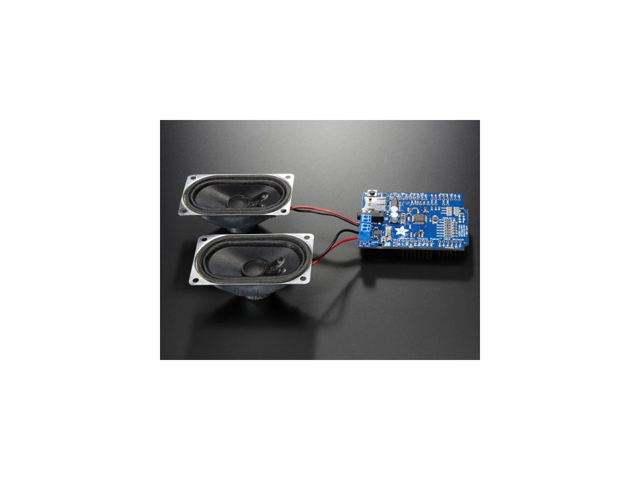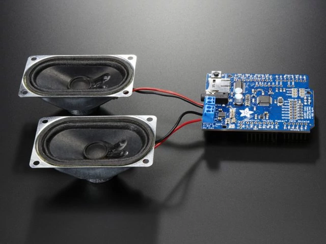 A csomag egy teljesen összeszerelt és tesztelt shieldet, 2 db 2-es sorkapcsot, egy 0,1"-os apa és 2x3 anya csatlakozót tartalmaz az ICSP-hez. Némi könnyű forrasztás szükséges az átmenő furatok segítségével az Arduinóhoz való csatlakoztatásához, valamint a hangszórókhoz való sorkapcsok esetében. A csomag hangszórót, fejhallgatót, SD-kártyát és az Arduinot nem tartalmazza!