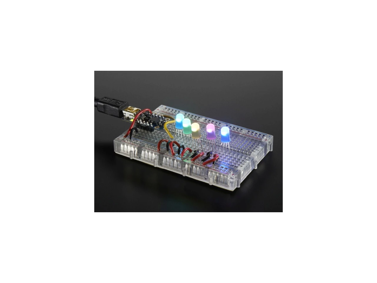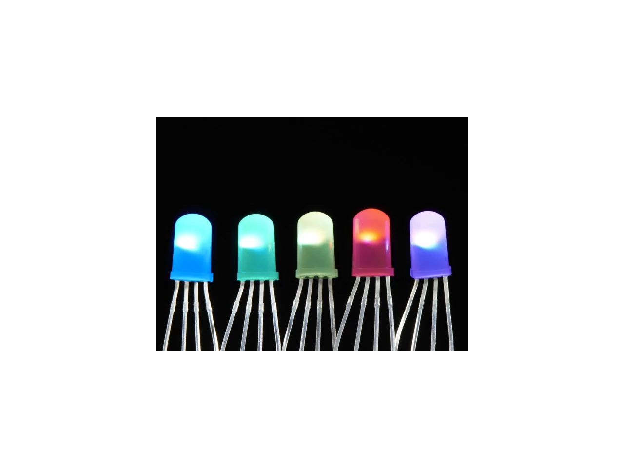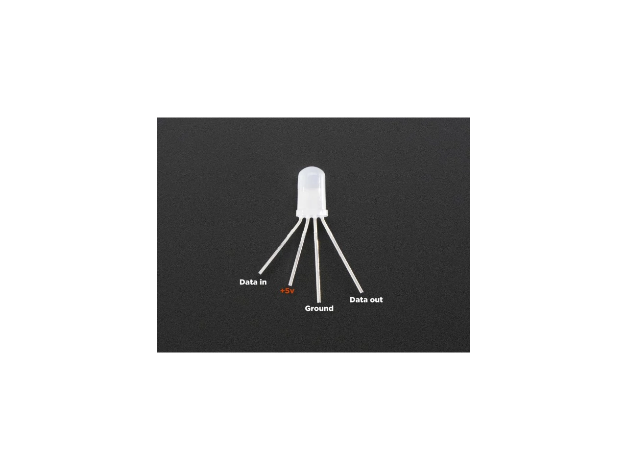 Adafruit 1938 NeoPixel Diffúz 5mm-es RGB LED - 5db/csomag. Ezek a LED-ek úgy néznek ki, mint a hagyományos 5mm-es RGB típusok, de rövidebb lábakkal rendelkeznek és vezérlésük két kivezetésen nagysebességű PWM jellel történik. A másik két lábra 5V-os tápfeszültséget kell kötni, így könnyedén sorba fűzhetőek és 24 bites színmélységet produkálva alkalmazhatóak. Vezérlésükhöz használható akár Arduino vagy Trinket. RGB helyett GRB formátumot használnak!