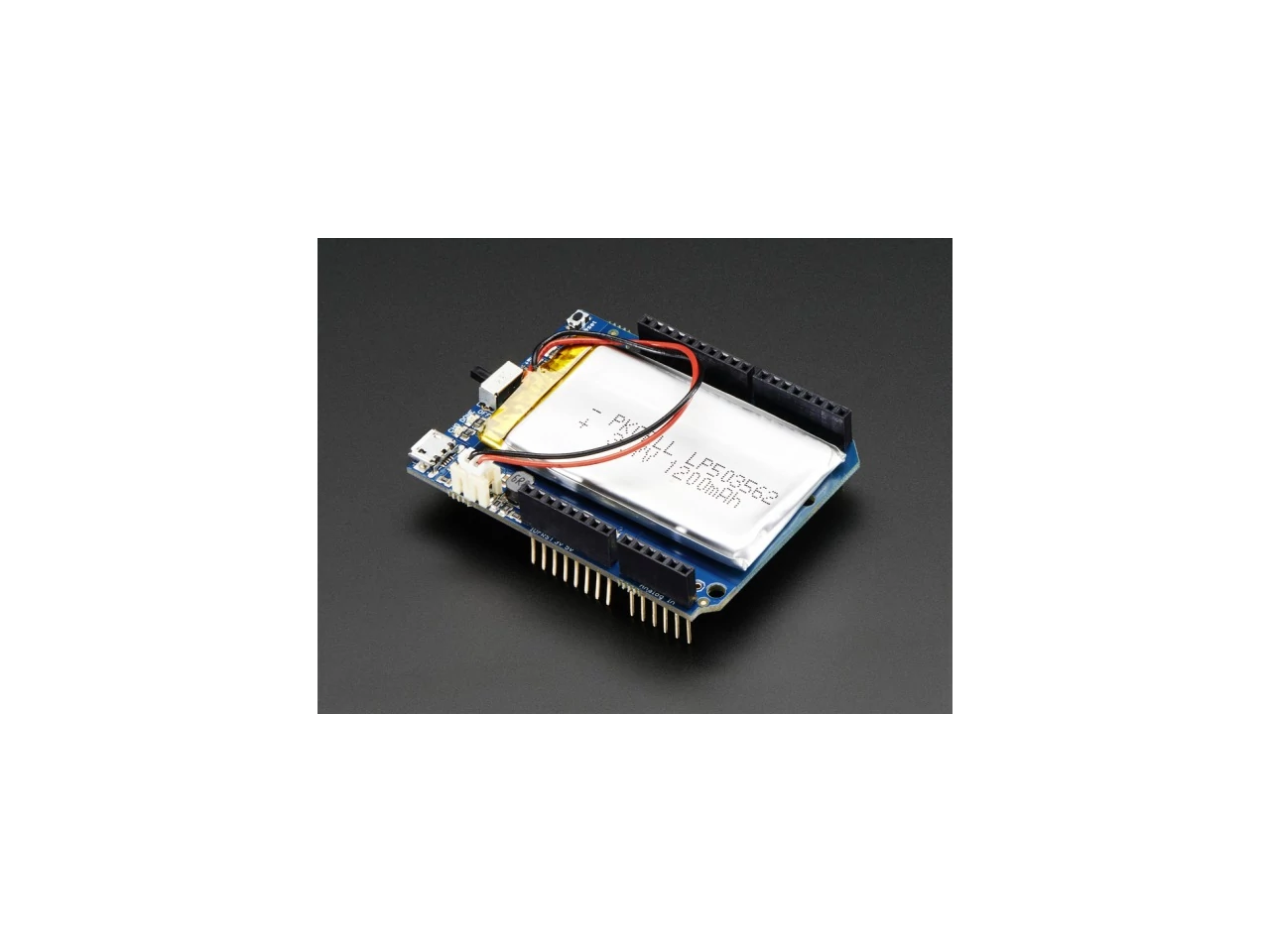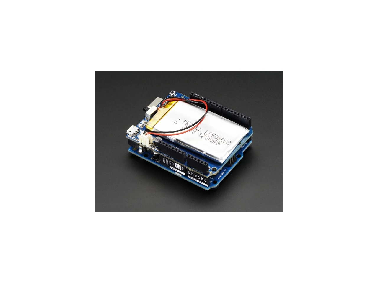 A PowerBoost pajzs bármilyen lítium-ion vagy lítium-polimer akkumulátorral (3,7/4,2V-os fajta) működhet, de mi az 1200mAh vagy 1850mAh kapacitású akkumulátorainkat javasoljuk. Mindkettő nagyon szépen elfér a pajzs üres területén. Kizárólag védőáramkörrel ellátott Lipoly akkumulátorokat használj! Csatlakoztasd az akkumulátort és töltsd fel a panel micro-USB csatlakozóján keresztül. Ha készen állsz, csak húzd ki az Arduinót az USB-ből vagy a fali adapterről, és automatikusan átvált a shield áramellátására. Csak védőáramkörrel ellátott Li-polimer akkumulátorokat használj!