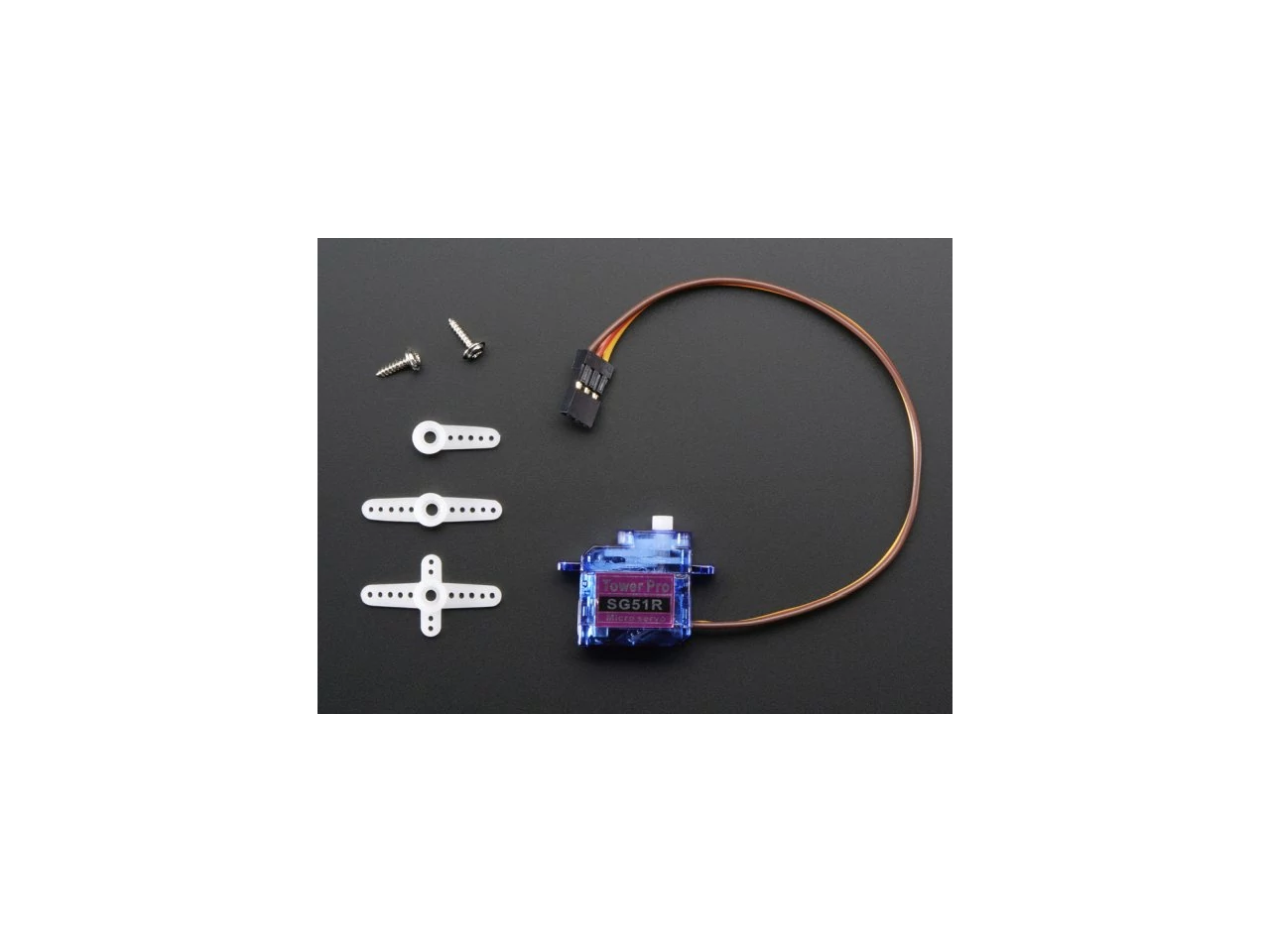 This is just about the cutest, tiniest little micro servo we could find, even smaller than the 9-gram micro servos we love so much. It can rotate approximately 180 degrees (90 in each direction) and works just like the standard kind you're used to but much smaller. You can use any servo code, hardware, or library to control these servos. Good for beginners who want to make stuff move without building a motor controller with feedback & gearbox, especially since it will fit in small places. Of course, it's not nearly as strong as a standard servo. Works great with the Motor Shield for Arduino or by just wiring up with the Servo library. Comes with a few horns and hardware.