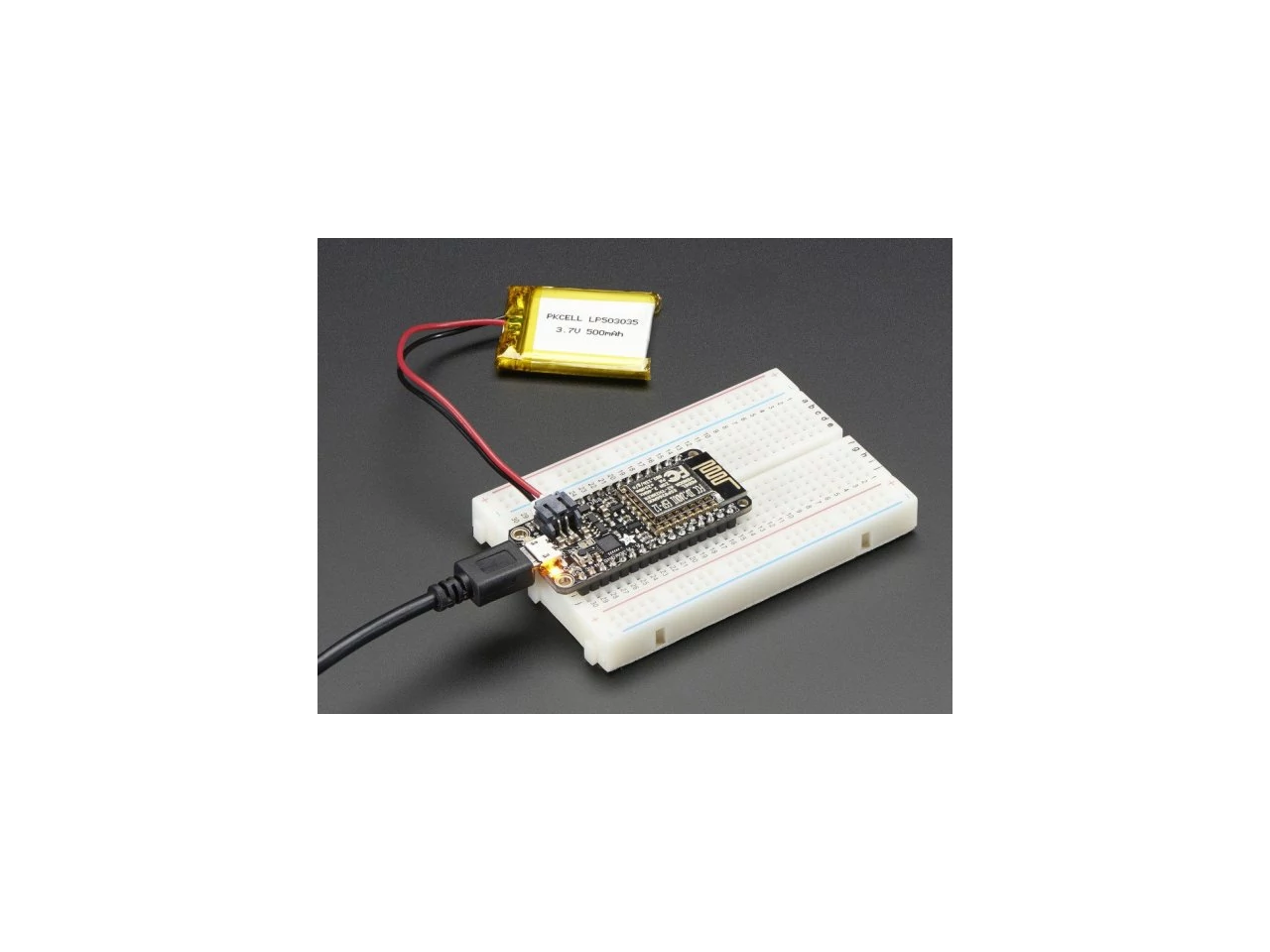 A hordozható alkalmazások támogatására a terméket 3.7V-os Lithium polymer akkumulátorokhoz egy csatlakozóval, illetve intelligens töltő elektronikával is ellátták. Természetesen az akkumulátor nem működési feltétel, a Feather automatikusan kapcsol át az USB áramforrásra - amennyiben az elérhető.