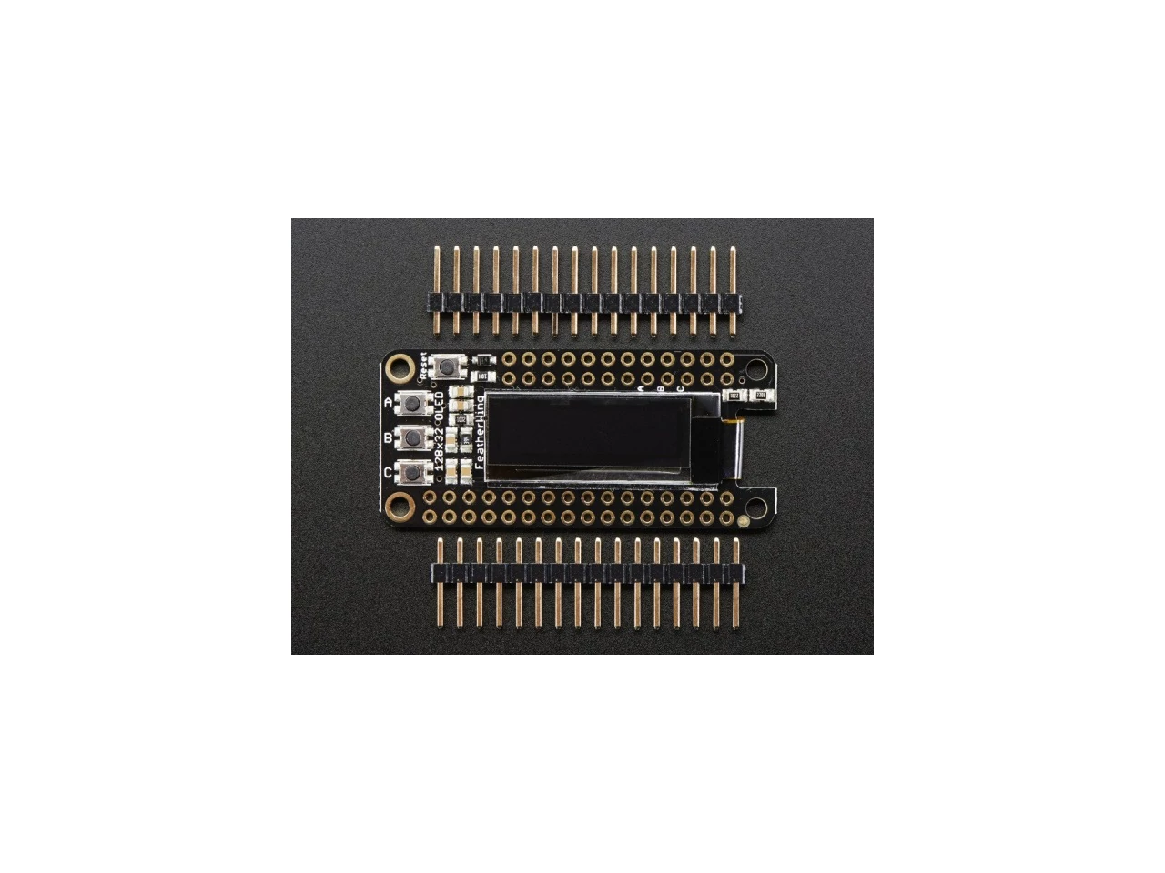 A Feather board without ambition is a Feather board without FeatherWings! This is the FeatherWing OLED: it adds a 128x32 monochrome OLED plus 3 user buttons to any Feather main board. Using our Feather Stacking Headers or Feather Female Headers you can connect a FeatherWing on top of your Feather board and let the board take flight!