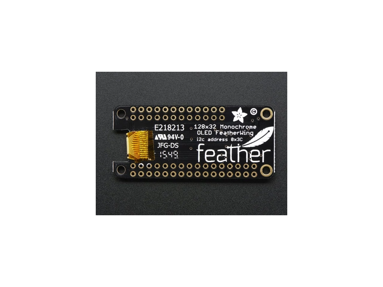 A Feather board without ambition is a Feather board without FeatherWings! This is the FeatherWing OLED: it adds a 128x32 monochrome OLED plus 3 user buttons to any Feather main board. Using our Feather Stacking Headers or Feather Female Headers you can connect a FeatherWing on top of your Feather board and let the board take flight!