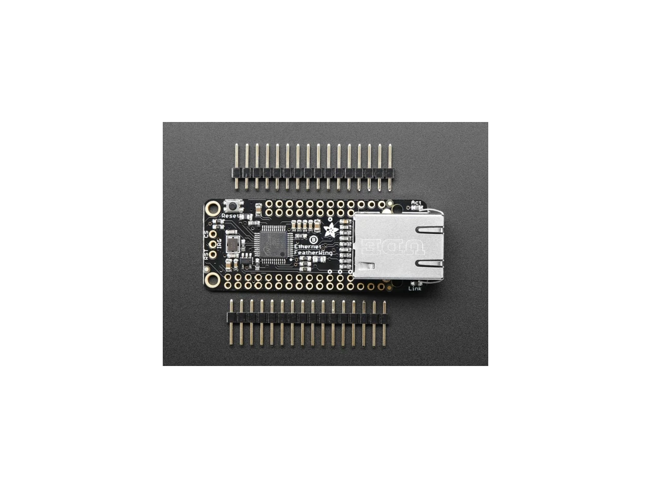 Ethernet is a tried-and-true networking standard. It's supported by every hub and switch, and because there's a physical connection you don't have to noodle around with SSIDs, passwords, authentication schemes or antennas. It works great with any of our Feathers, the WIZ5500 chip communicates over SPI plus a single CS pin. The Arduino Ethernet2 library works great, and within a few seconds after connecting, will do the DHCP setup for you. As a nice extra, the RJ-45 jack has both link and activity lights that will light/blink to let you know the current connection status.