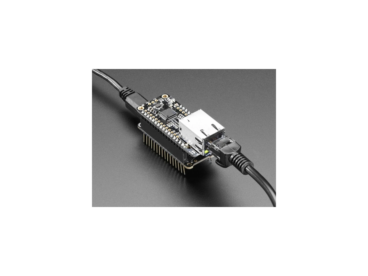 Ethernet is a tried-and-true networking standard. It's supported by every hub and switch, and because there's a physical connection you don't have to noodle around with SSIDs, passwords, authentication schemes or antennas. It works great with any of our Feathers, the WIZ5500 chip communicates over SPI plus a single CS pin. The Arduino Ethernet2 library works great, and within a few seconds after connecting, will do the DHCP setup for you. As a nice extra, the RJ-45 jack has both link and activity lights that will light/blink to let you know the current connection status.