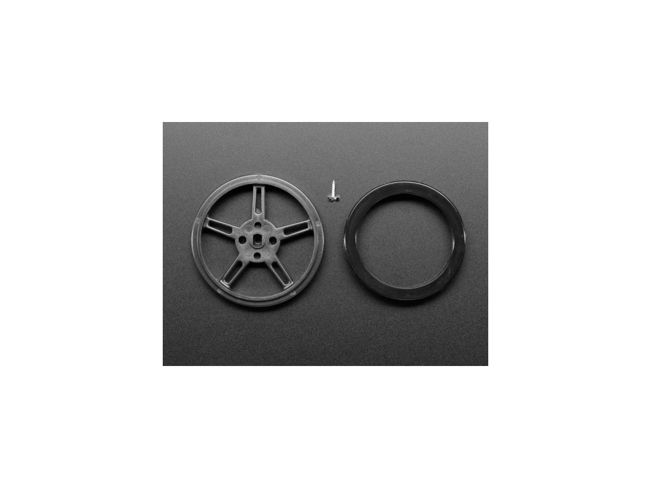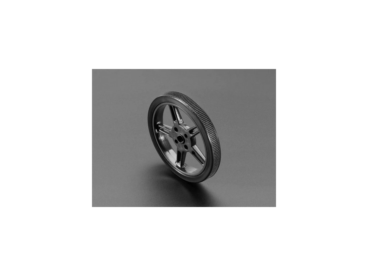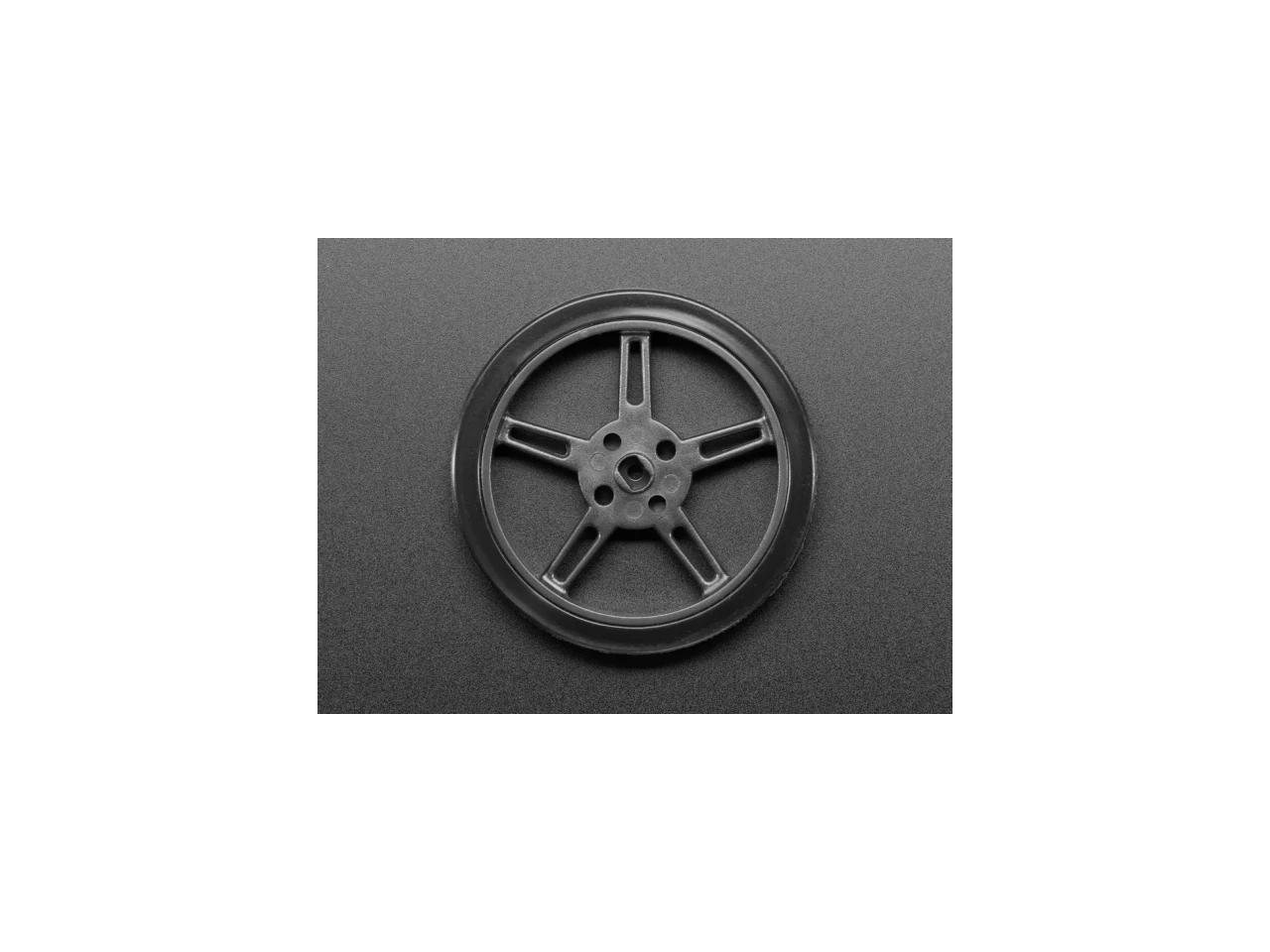 This TT DC Motor Wheel is solid, but thin, so it won't make your robot bulky. It even comes in Adafruit black! Each order comes with one wheel, one silicone tire, and a small Phillips screw to make connecting super quick and easy. Despite looking just like our continuous rotation servo wheel, this wheel is only for use with 'TT' gearbox DC motors!