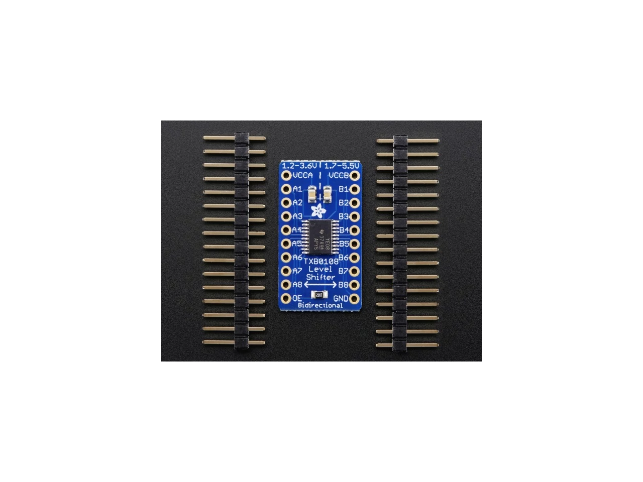 Ez a panel megkímél attól, hogy a TXB0108-as IC nagyon apró lábait kelljen forrasztgatnod. A mellékelt tüskesorok alkalmazásával közvetlenül próbapanelre tudsz csatlakozni. Használd egészséggel!