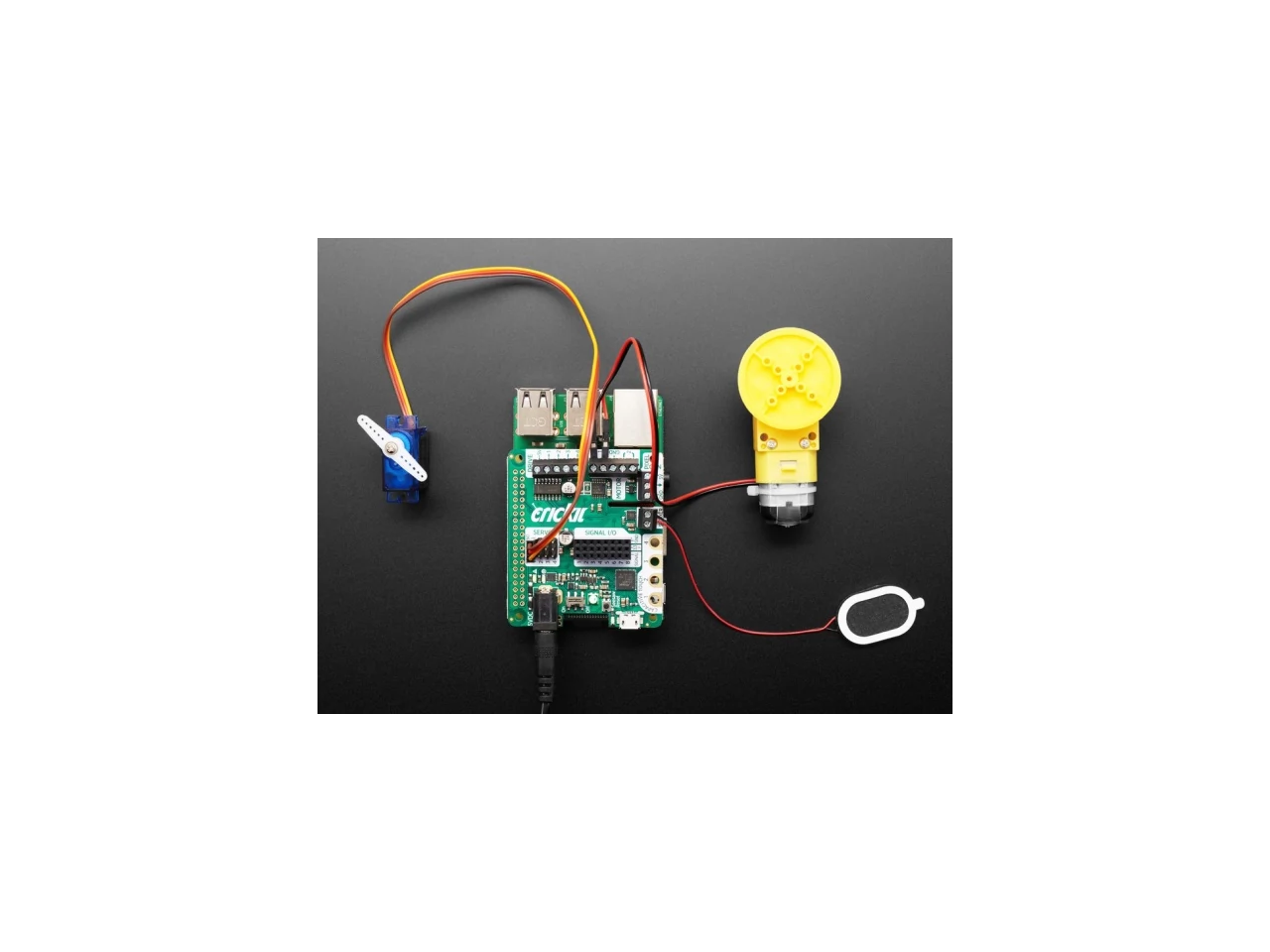 Plug the Crickit HAT onto your Pi using the standard 2x20 GPIO connector and start controlling motors, servos, solenoids. You also get 8 signal pins with analog inputs or PWM outputs, capacitive touch sensors, a level-shifted NeoPixel driver and 3W amplified speaker output from the I2S port. It complements & extends your Pi, doing all the things a Pi can't do, so you can still use all the goodies on the Pi like video, camera, Internet, bluetooth... but now you have a robotics playground as well.