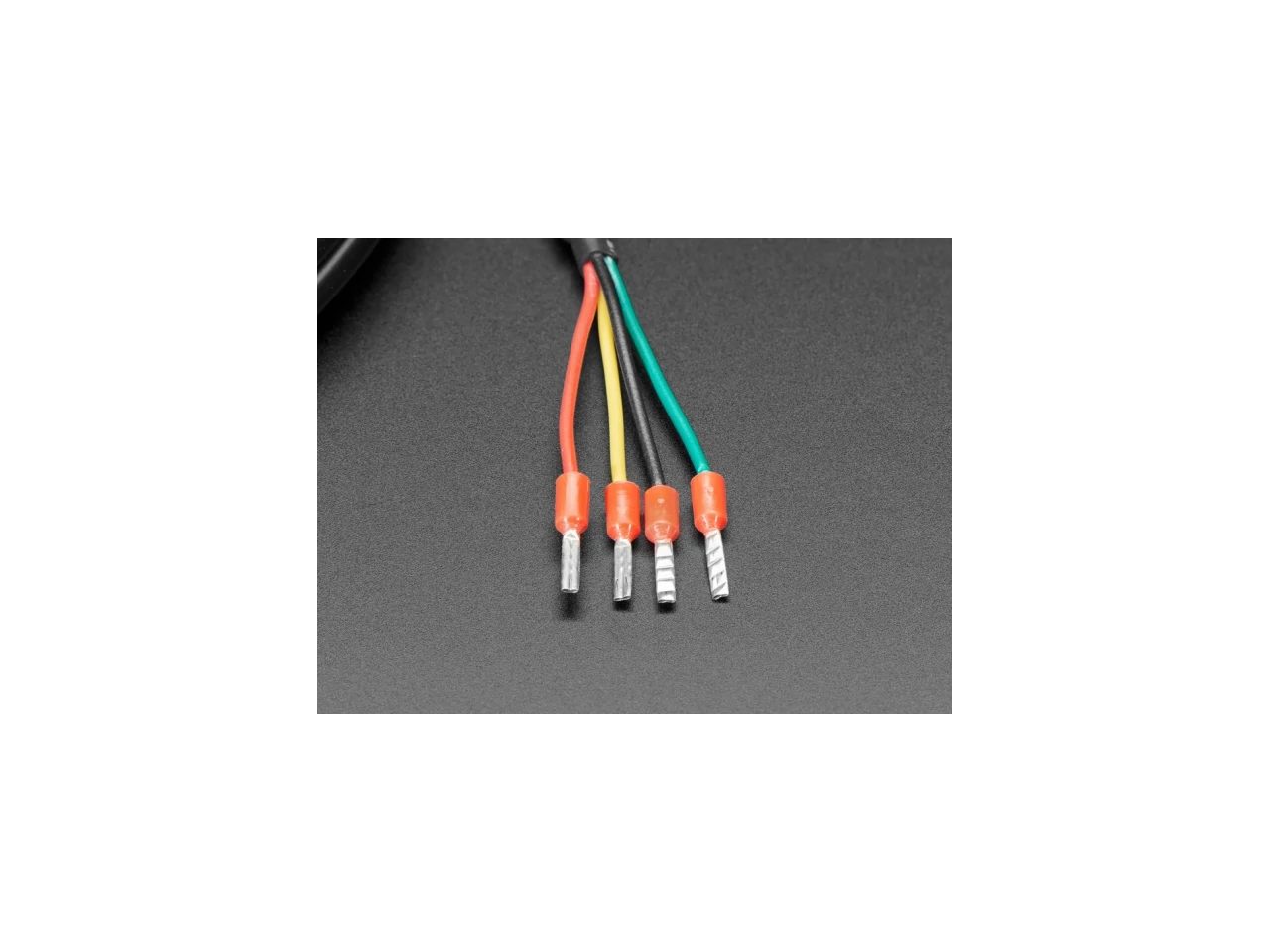 The 1 meter long cable has four wires: Brown = VCC (3-5VDC), Black = Ground, Yellow = Data, Blue = Clock.