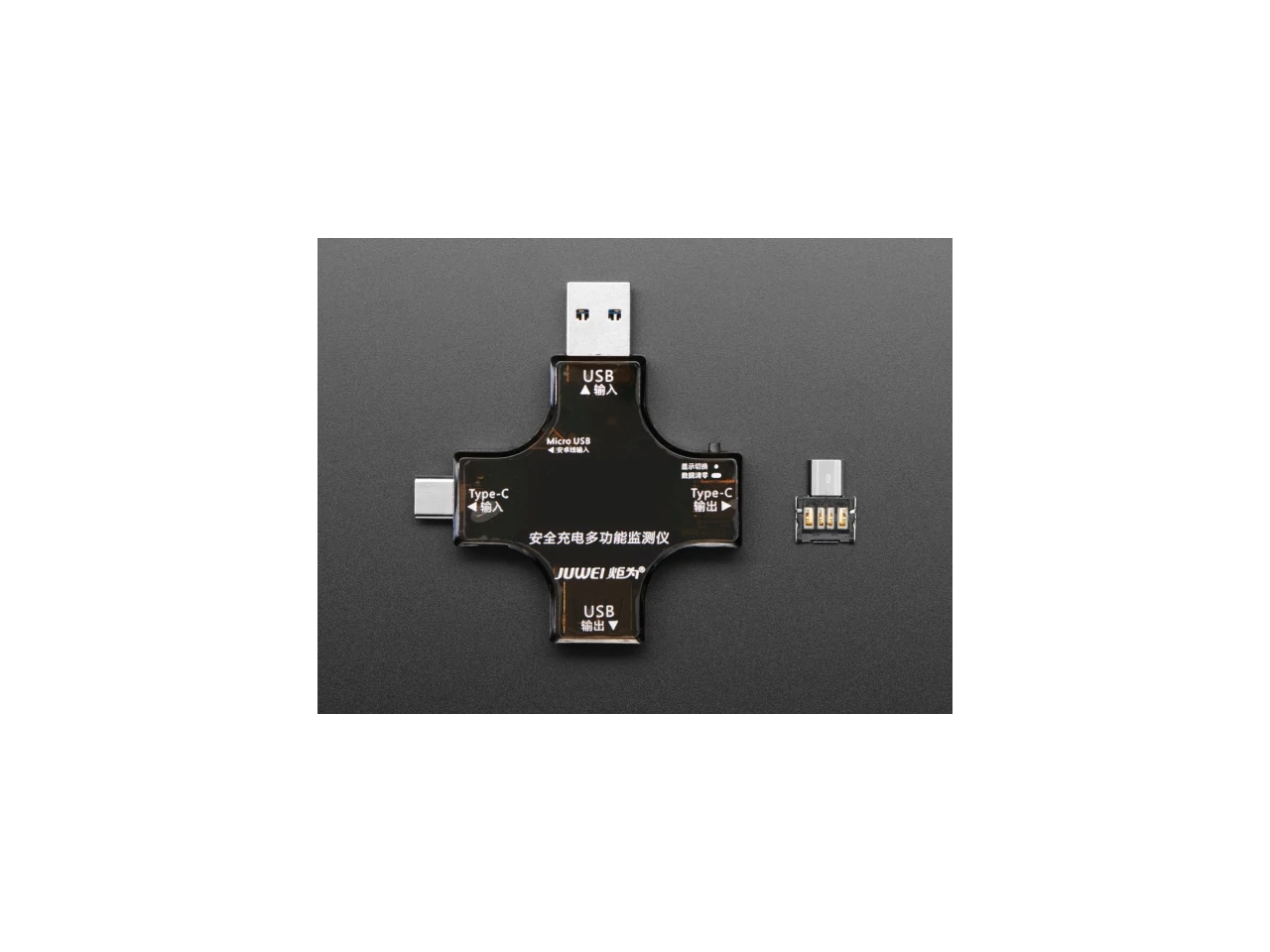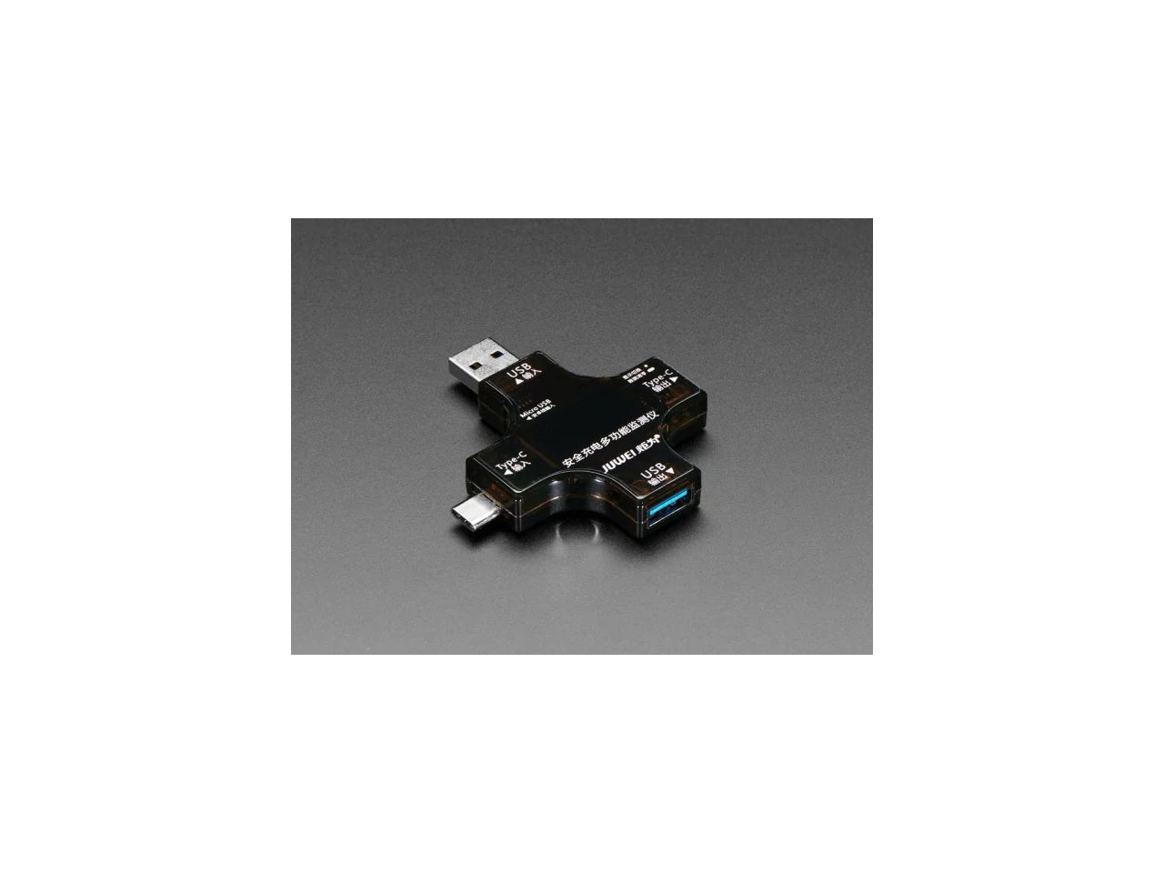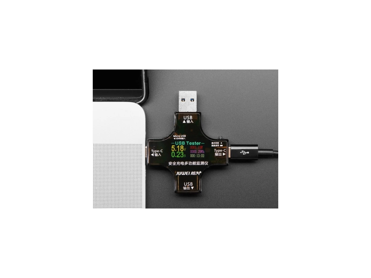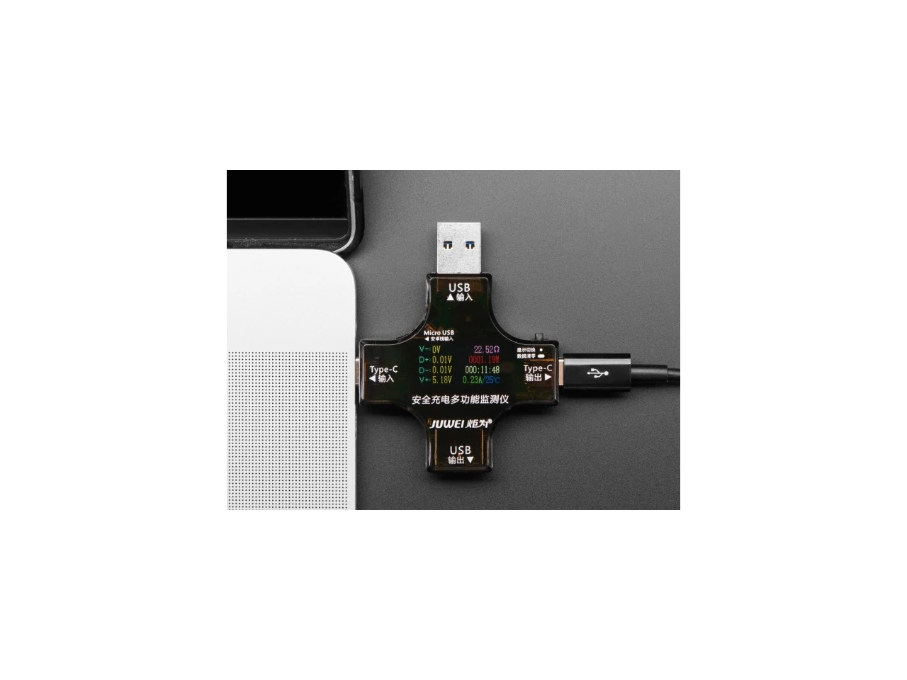 This handy (pun intended?) tool can measure voltage, current, power, charge time, and other measurements for USB A, Micro B, and USB C! It features a colorful display that pops up when you plug in a power supply. Each click of the button gives you a different display and readout. A long press will reset the data for when it does Coulomb-counting (total power consumption). We like the simple display that comes up first with big Voltage and Current output, but you have lots of options.