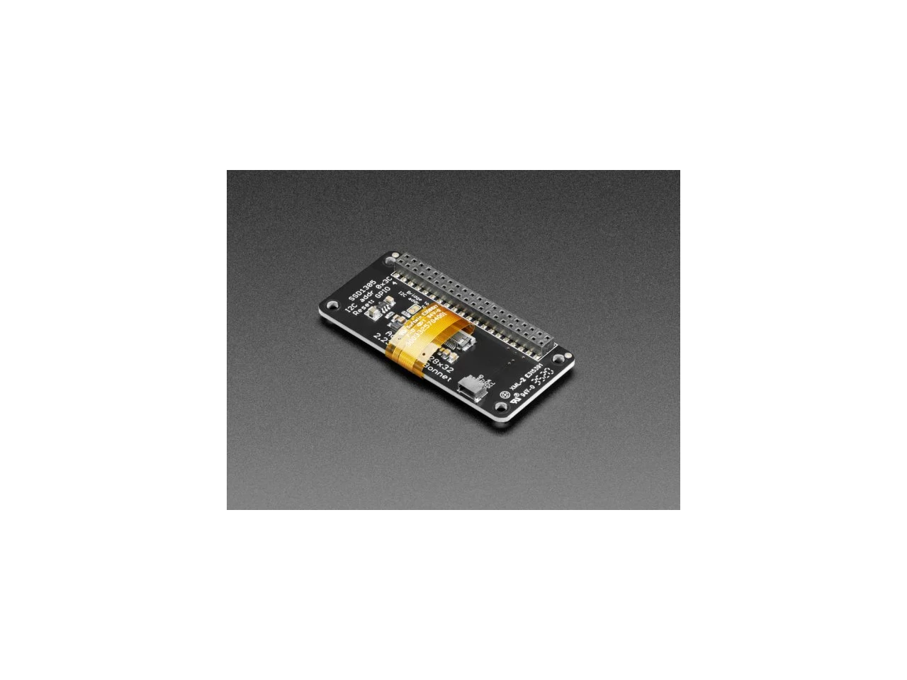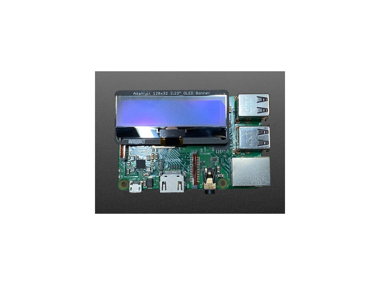 The Adafruit 2.23" Monochrome OLED Bonnet for Raspberry Pi is your chonky OLED pal, ready to snap onto any and all Raspberry Pi computers, to give you a vivid display. The Bonnet comes with a 2.13" diagonal monochrome 128x32 OLED, with sharp white pixels. The OLED the I2C pins plus GPIO #4 for reset, so you have plenty of GPIO connections available for buttons, LEDs, sensors, etc. It sits nice and flat so many cases that have an open top can have this display inserted.