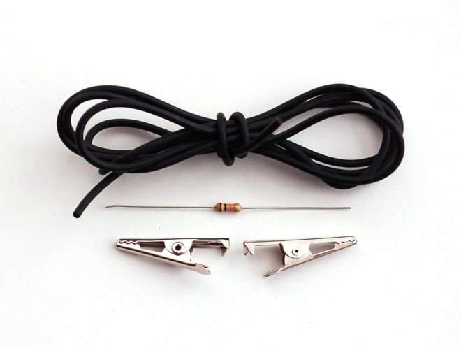 Ez a 'cucc' nagyon szórakoztató, ezért egy teljes métert és két krokodilcsipeszt (ami a kábelhez csatlakozik), valamint egy 10K értékű ellenállás adunk a csomagban. Együtt használva ezeket egyszerűen készíthető egy feszültségosztó.
