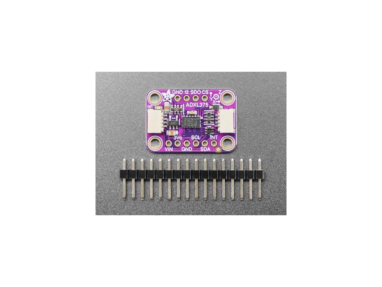 The ADXL375 looks and acts nearly identically to its in specifications to the little sisters ADXL345 and ADXL343. Those are only +-16g max, and have adjustable ranges. This sensor acts and looks the same except that you cannot change the range, and it's fixed at 200g. Otherwise, existing library code will 'just work' so if you happen to be using something other than Arduino or CircuitPython, the port is pretty easy and code written for the '345/'343 will likely work on the '375 with just a scaling adjustment.