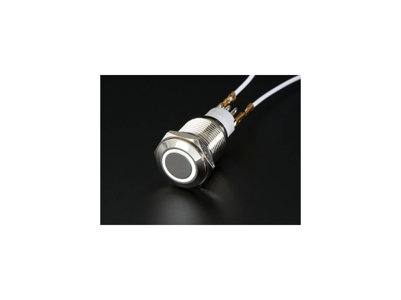A nyomógomb közepe, a lapos fém működtető rész körül fehér műanyag LED gyűrű található. A hátoldalon van 3 kivezetés a működtetett egyáramkörös kétállású kapcsolónak és 2 darab a LED gyűrűnek. A LED meghajtásához 3-6V közötti feszültségre van szükség, hogy szépen világítson a gyárilag beépített ellenállással. Ha szeretnéd magasabb feszültségről használni, mondjuk 12 vagy 24V-ról, akkor egyszerűen adj hozzá egy 470 ohmos ellenállást sorba kötve a LED-el. A LED árama 20mA körüli.