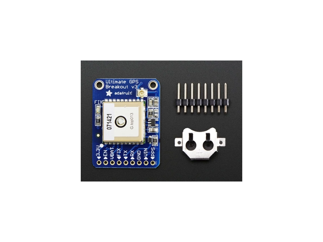 A rendelésedhez egy teljesen összeszerelt és tesztelt modult kapsz, valamint egy csatlakozó fejet, amelyet a modulhoz forraszthatsz, ha breadboard-dal szeretnéd használni, továbbá jár hozzá még a CR1220-as gombelem foglalat is. A gombelem nem tartozéka a csomagnak, külön kell beszerezned azt, ha használni szeretnéd a GPS RTC funkcióját.