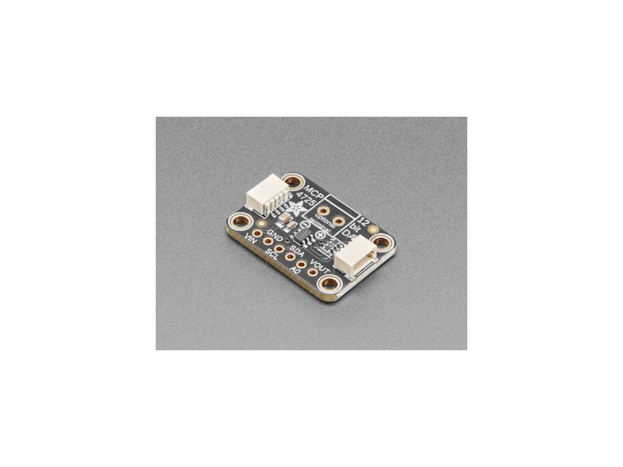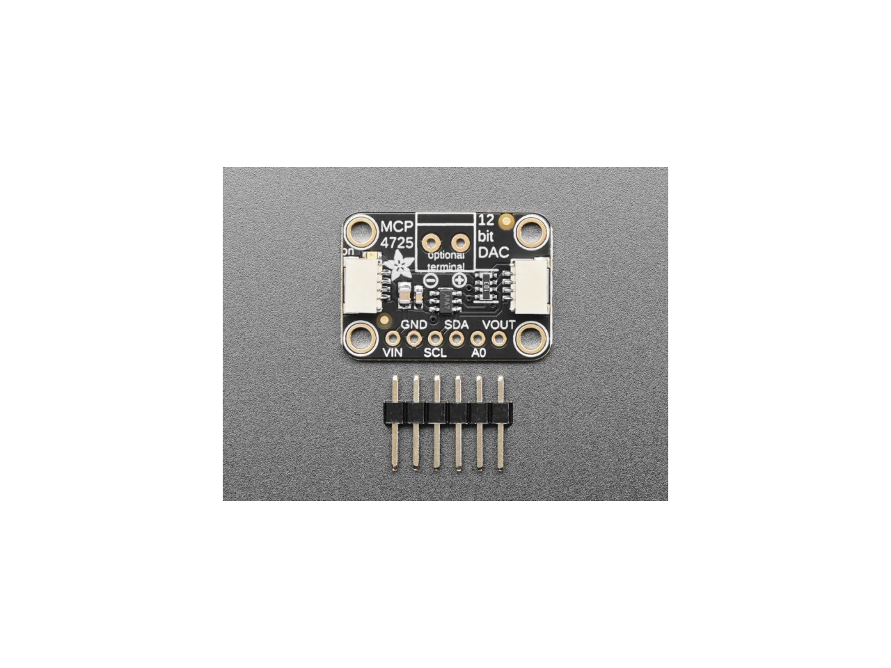 Your microcontroller probably has an ADC (analog -> digital converter) but does it have a DAC (digital -> analog converter)??? Now it can! This breakout board features the easy-to-use MCP4725 12-bit DAC. Control it via I2C and send it the value you want it to output, and the VOUT pin will have it. Great for audio / analog projects, such as when you can't use PWM but need a sine wave or adjustable bias point.