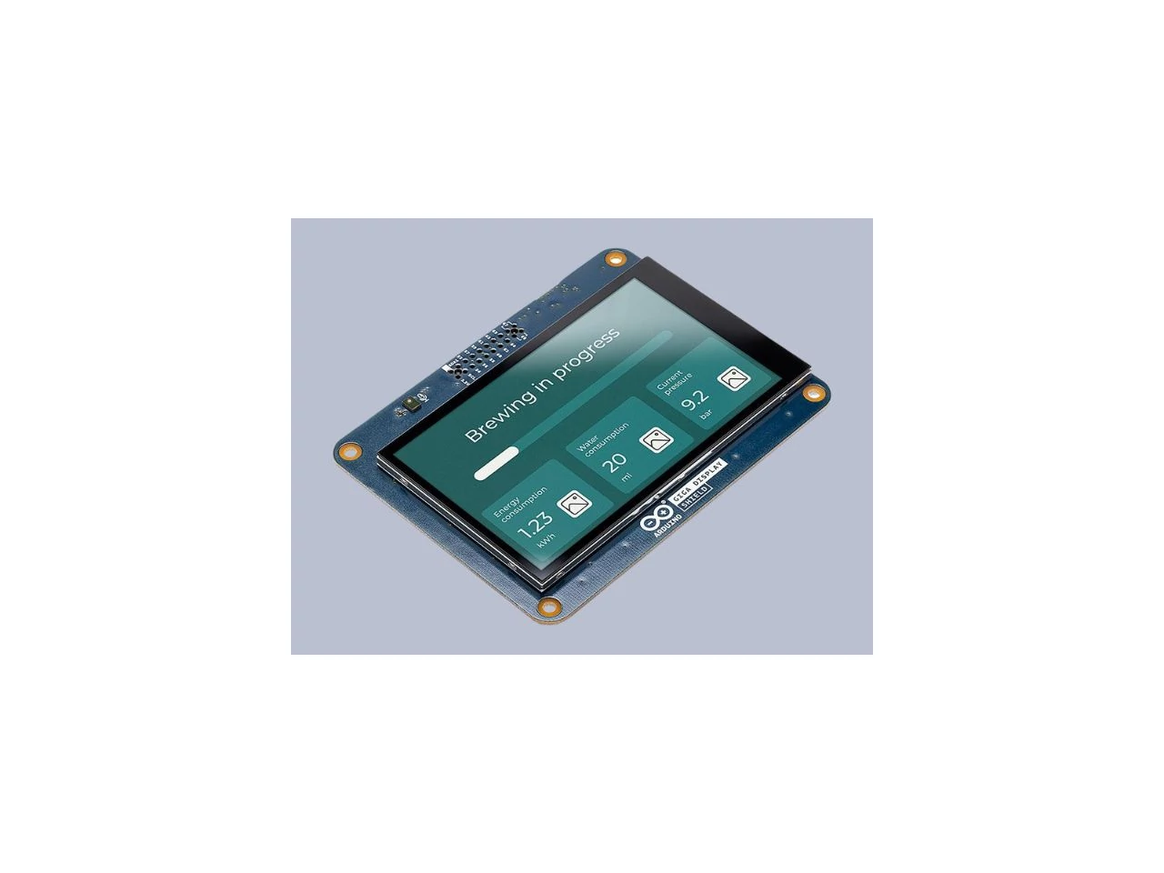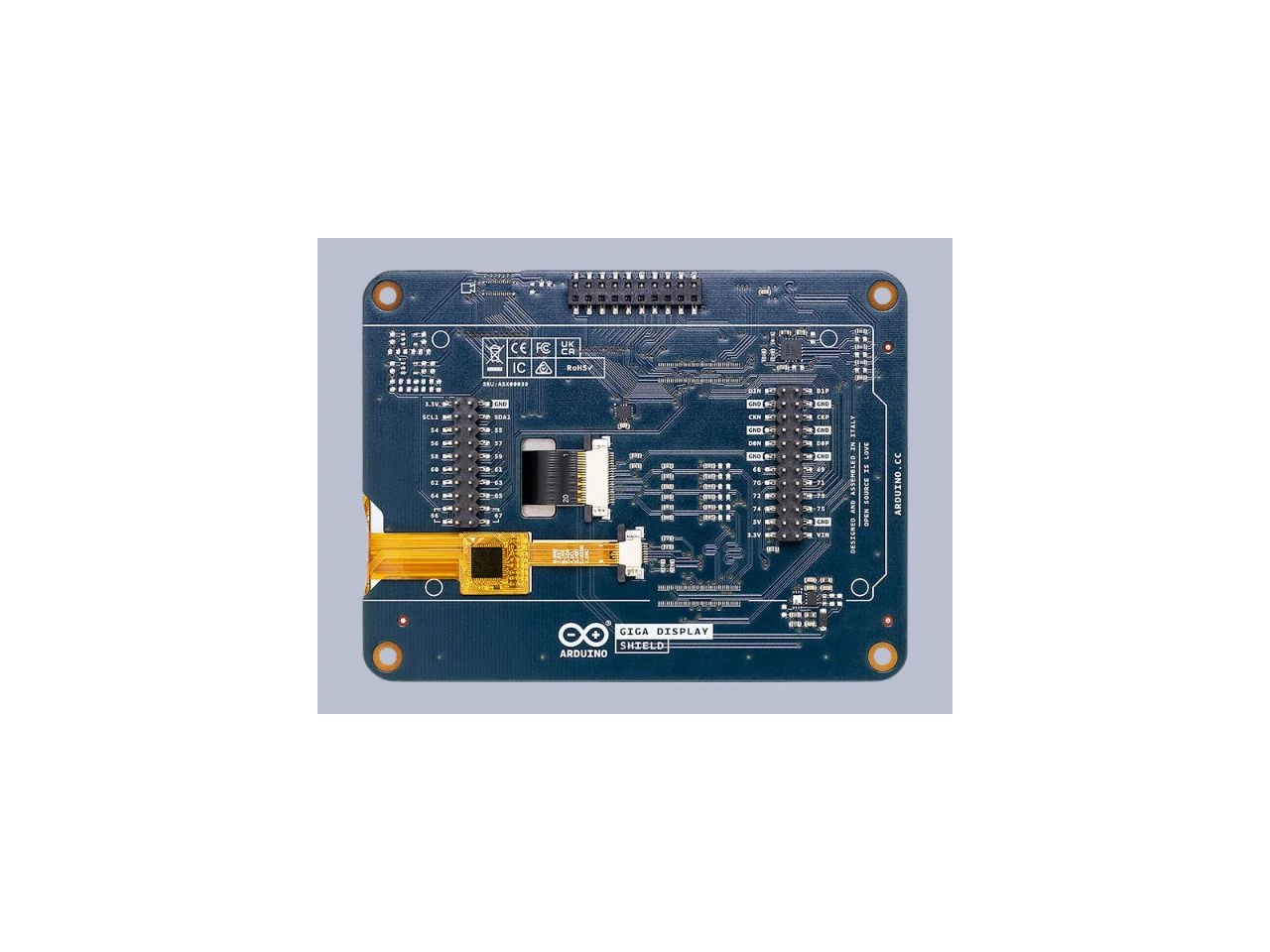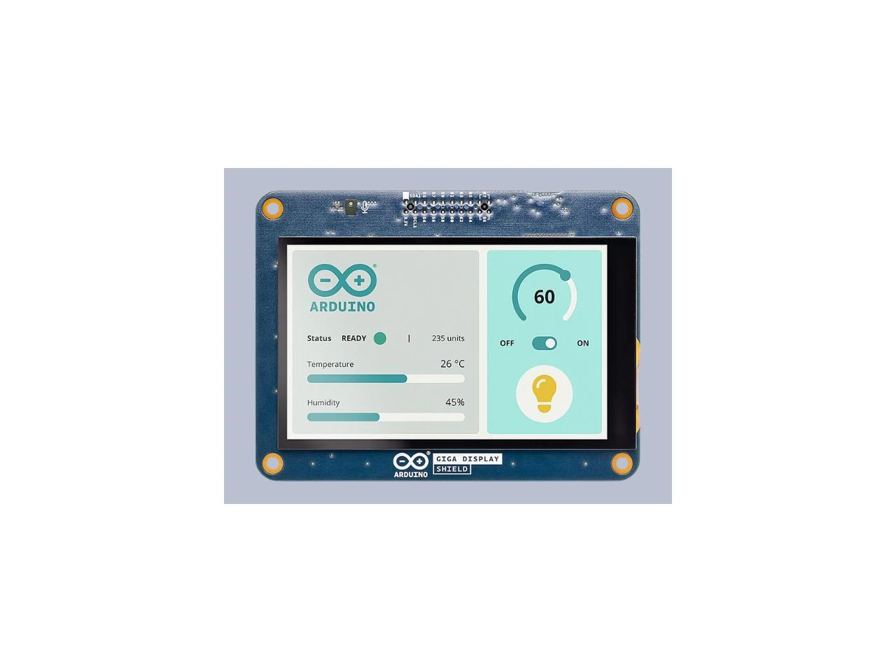 Az Arduino GIGA Display Shield egy érintőképernyős megoldás, amelyet úgy terveztek, hogy könnyedén létrehozhass grafikus felületeket a projektjeidhez. A GIGA R1 WiFi közepén található új tüskesoros csatlakozó segítségével ez a kijelző pajzs (shield) zökkenőmentes integrációt és továbbfejlesztett funkciókat kínál.