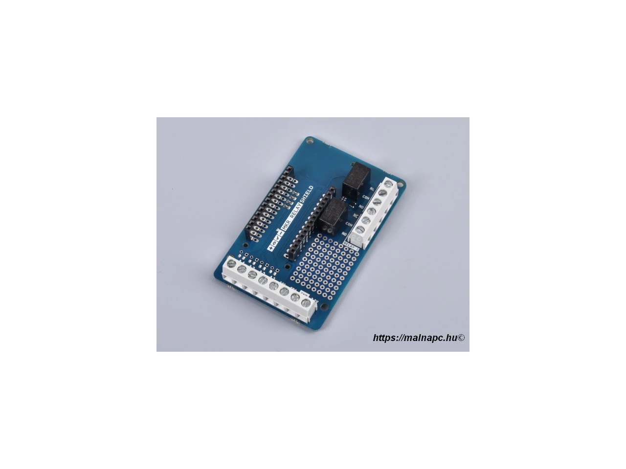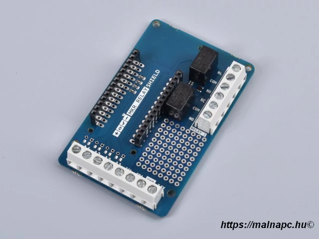 The MKR Relay Protoshield allows you to easily add relays to your MKR board based project. The shield provides two relays called RELAY1 and RELAY2 commanded by pin 1 and pin 2respectively. The shield also provides easy connection by means of screw terminal blocks to A1 toA4 analog inputs, I2C and supply voltages.