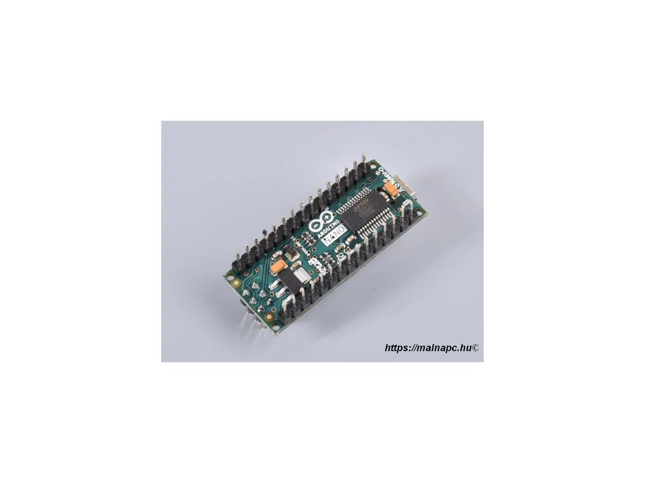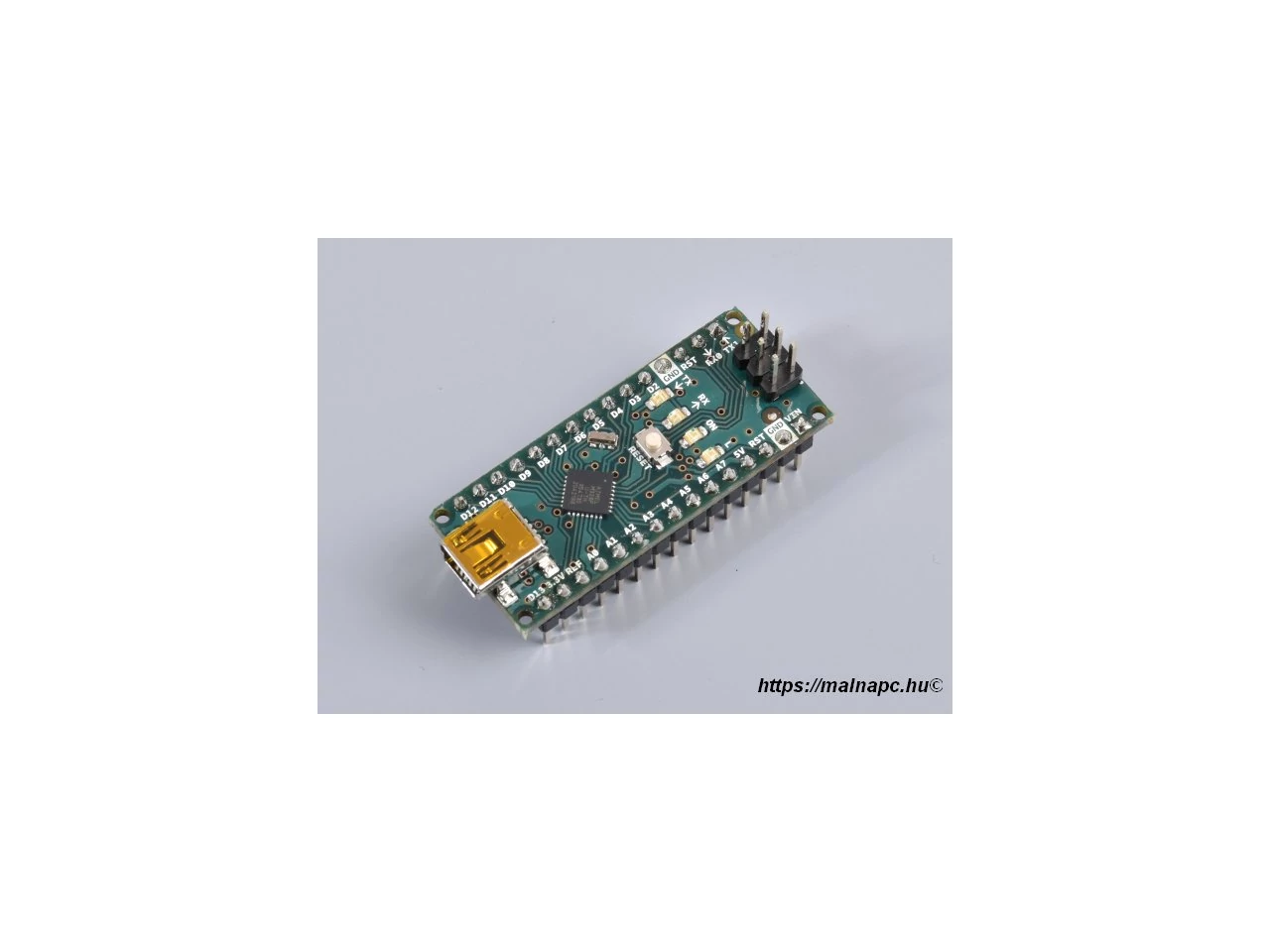 Arduino Nano - A000005 a népszerű Arduino UNO miniatűrizált verziója. SMD ATmega328 16MHz-es mikrokontrollerrel lett építve. Ugyanúgy 14db digitális ki/bemenettel (ebből 6db PWM képes) és 6db analóg bemenettel rendelkezik, de csak USB-n keresztül látható el tápfeszültséggel.