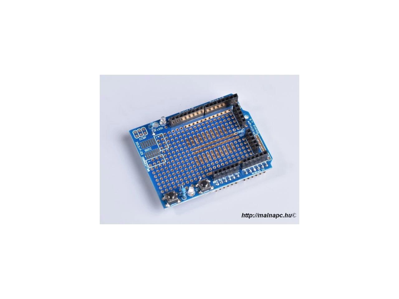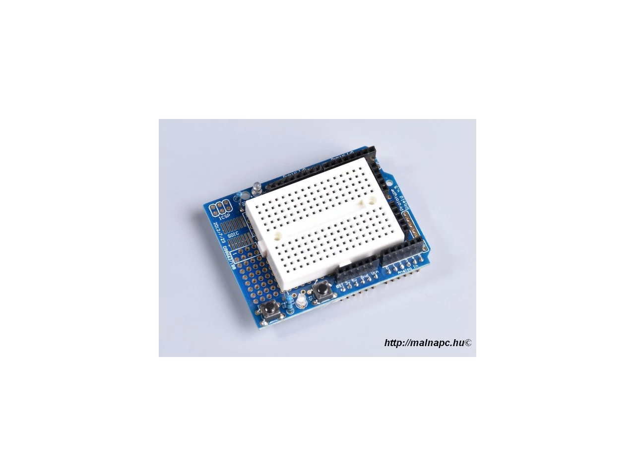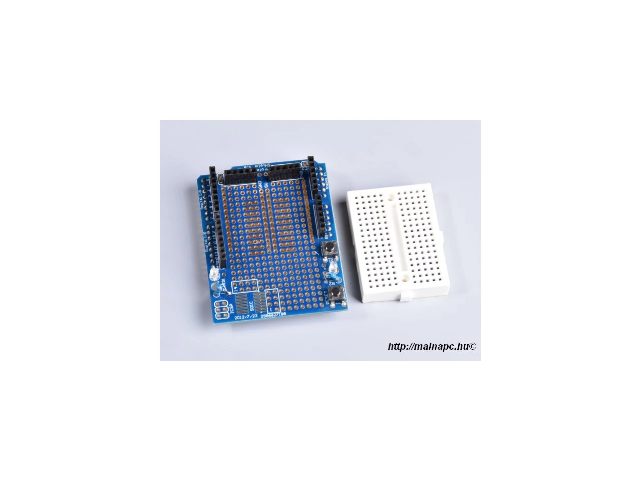 Arduino UNO-hoz prototípus panel - UNO Shield kompatibilis csatlakozással és kétféle használati móddal. Lehetőséged van hagyományos forrasztásos prototípus készítésére, vagy használhatod a mellékelt forrasztás nélküli próbapanelt is, ez csak rajtad múlik!