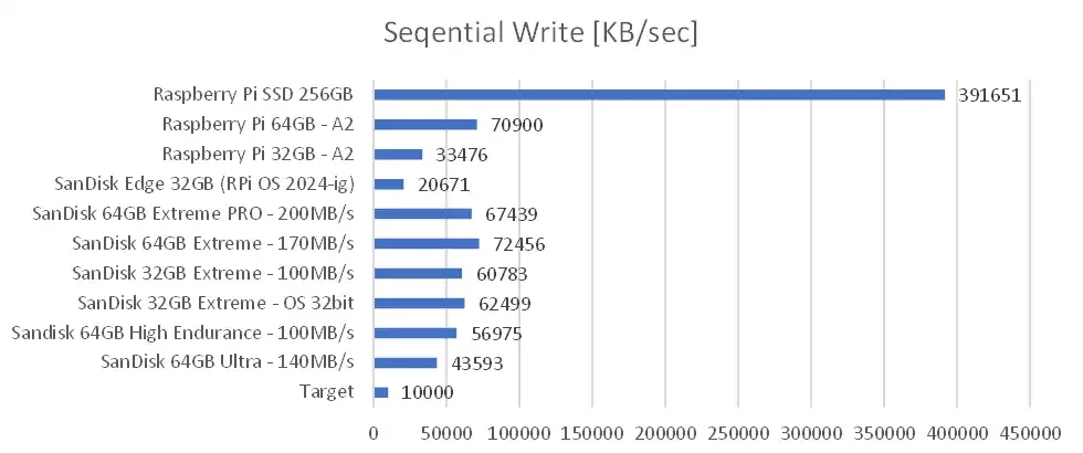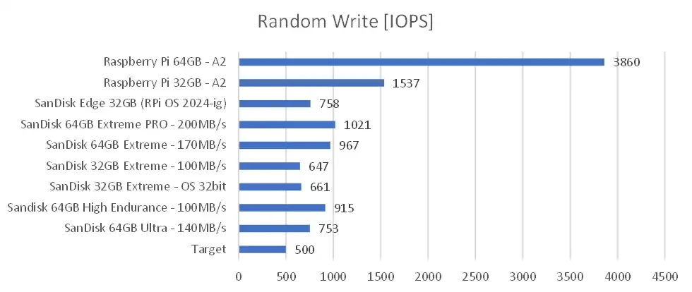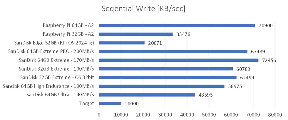 Itt a 32GB-os Extreme kártya vezet, de ne feledjük, hogy kapacitása csak fele akkora, mint a többi kártyának, valamint A1-es besorolású. Ha kivesszük az összehasonlításból a 32GB-os típusokat, akkor a Raspberry Pi OS-el ellátott új A2-es 64GB-os kártya a legjobb vétel, vagy ha valakinek a 30 év garancia fontosabb a sebességnél, akkor a dobogó második helyéről a Sandisk Extreme 64GB a jó választás.