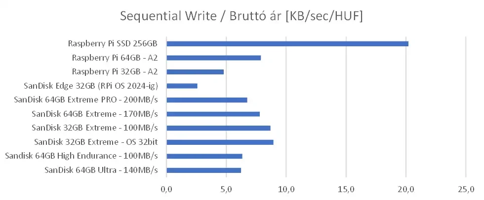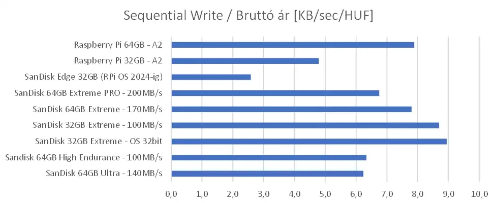 Joggal merül fel a kérdés: melyik kártya mennyire éri meg az árát? Ebbe igencsak bele lehetne bonyolódni, figyelembe véve a sebességet, kapacitást, árat, garancia idejét, valamint azt, hogy üres, vagy OS-el ellátott kártyánk van, stb.. Mi az egyszerűség mellett döntöttünk és a szekvenciális írási sebességet elosztottuk a bruttó vételárral. Amit kaptunk, az megmutatja, hogy 1 forintért hány KB/sec szekvenciális írási sebességet kapunk. Természetszerűleg a magasabb érték a jobb.